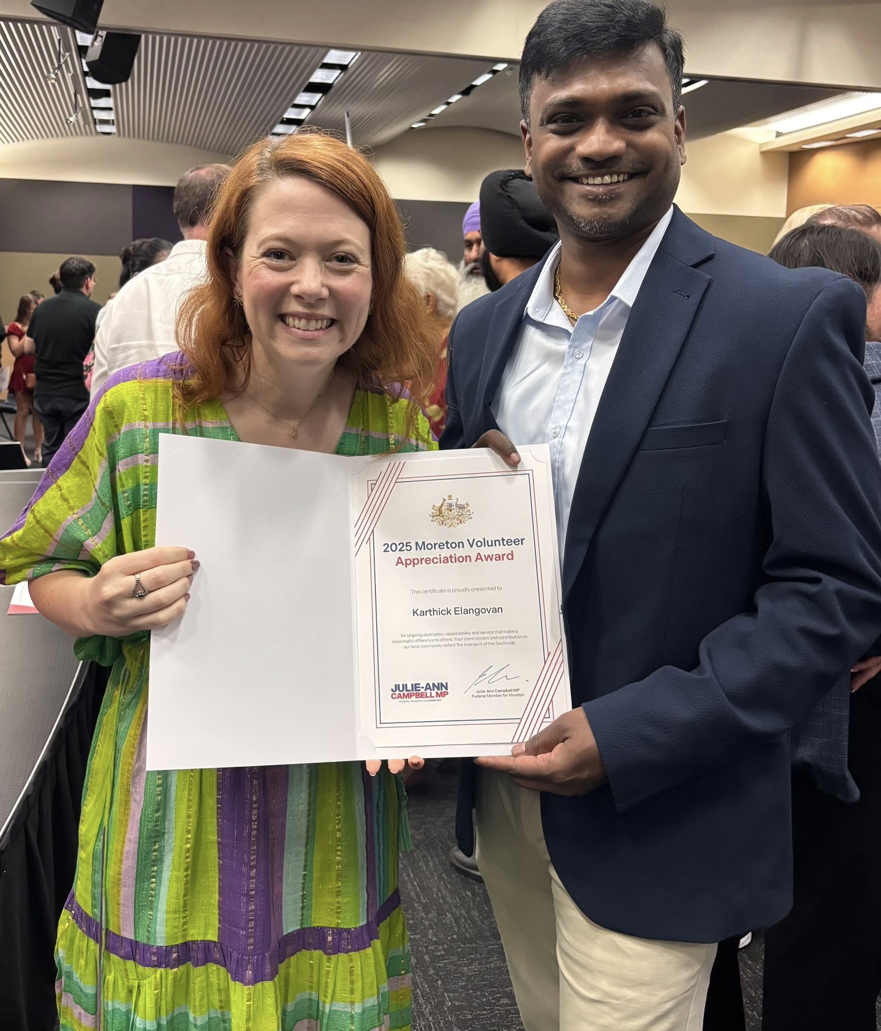 Community service and volunteer leadership were recognised with Tamil Association of Queensland president Karthick Elangovan receiving the Moreton Volunteer Award 2025, highlighting the growing impact of multicultural organisations across the region.