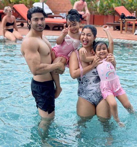 The carousel post begins with a heartwarming pool moment where Gurmeet is seen holding one of their daughters while Debina, dressed in a stylish swimsuit, lifts the other.