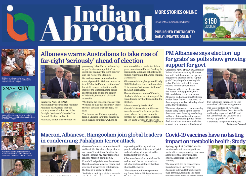 Indian Abroad is a news channel and fortnightly newspaper meant for Australia’s Indian community and, besides news, focuses on lifestyle subjects like health, travel, culture, arts, beauty, fashion, entertainment, Bollywood, etc. Our YouTube channel here features daily news bulletins besides infotainment videos on lifestyle subjects.