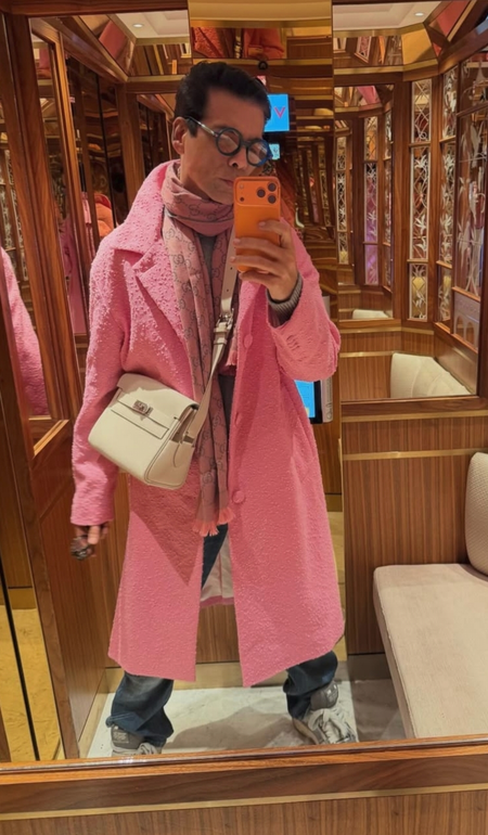 In another picture, Karan is seen sporting a fur coat with tinted glasses and a hat. He strokes a classy pose in a pink overcoat look inside a mirrored elevator adding drama. In another click, Karan dons a cream double-breasted coat with oversized sunglasses.