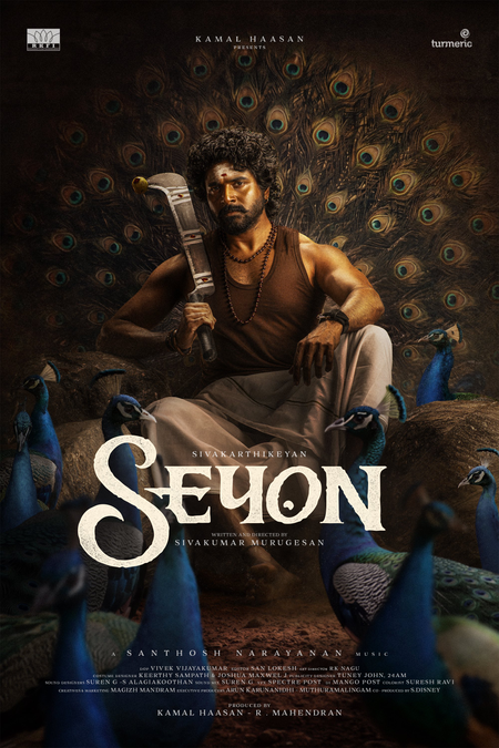 The title look poster has Sivakarthikeyan seated on what appears to be a stone throne adorned with peacock feathers with a machete placed over his shoulder. The actor has well oiled hair and is seen in a rural get up. He sports a well toned physique and is surrounded by peacocks.